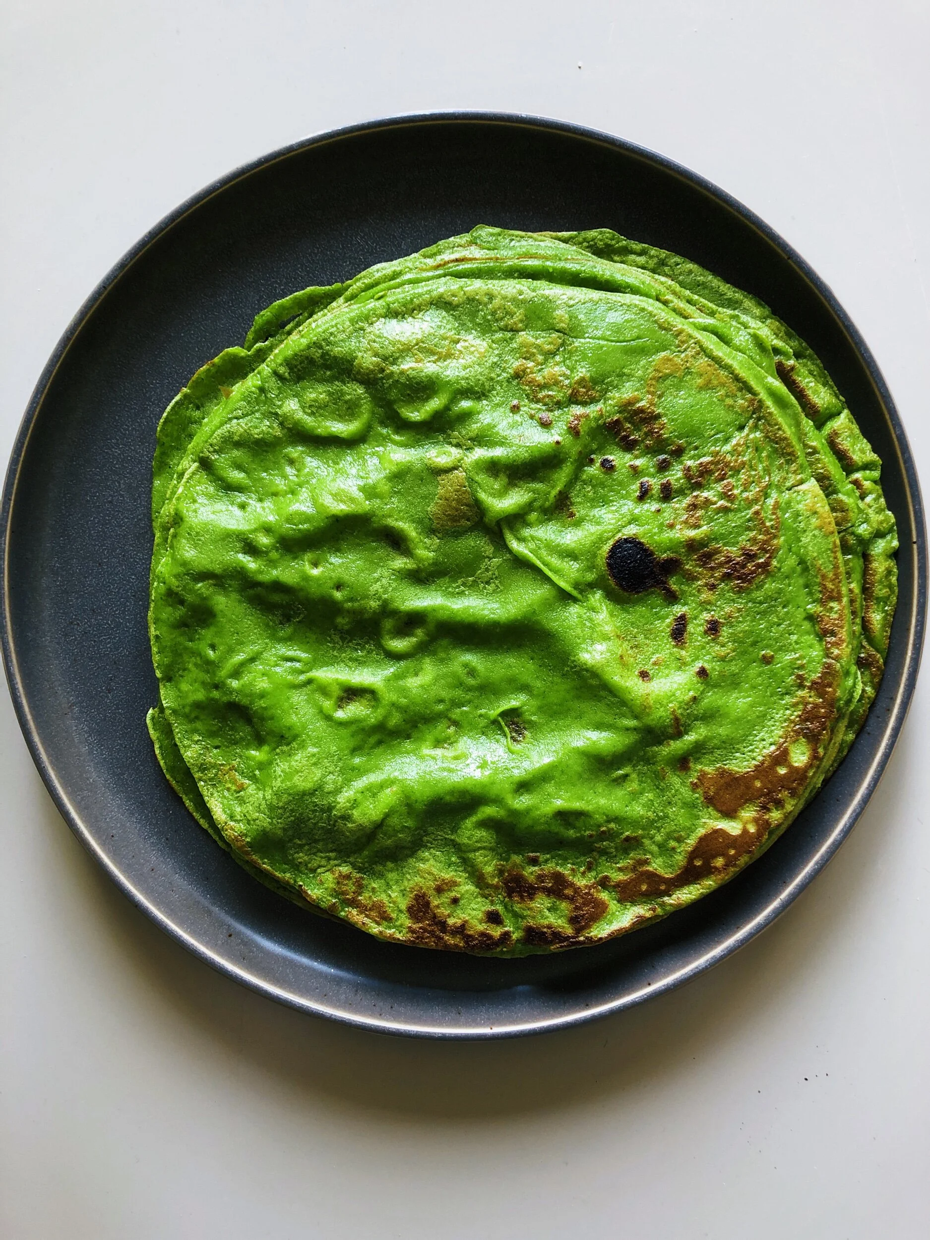 This is not the case for these green crepes. I am calling cakes but in Brazil we call them pancakes, they are like savory crepes (there’s no sugar on the batter and no butter - or other oil). Also it’s a bit more thick than a crepe too. In Brazil we eat these as you would with enchiladas: savory filling with some sauce and cheese on the top, then you place in the oven and broil until the cheese is melted.
